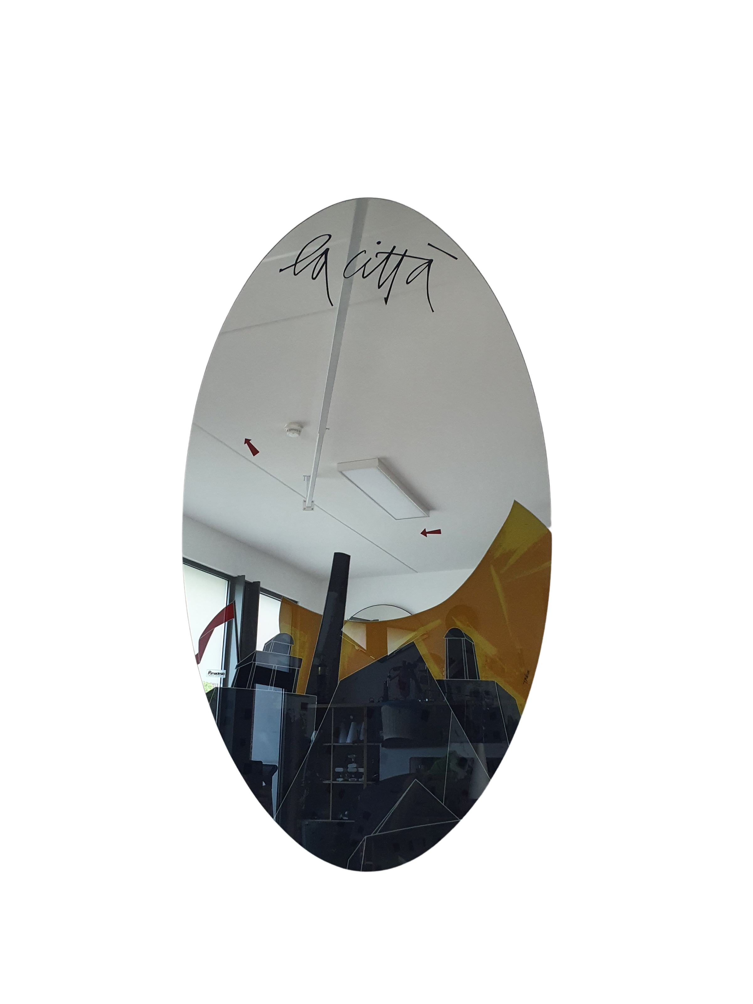 Emilio Tadini "La Città" mirror Mirror made from wood, mirrored glasses and serigraph printed. The title is at the top, the artist's signature on the right hand side and company brand mark on the back. Maker: Rimadesio, Italy This is from a set of artwork that Emilio Tadini created for the furnishing company Rimadesio, Italy. Rare design piece. Year: 1983