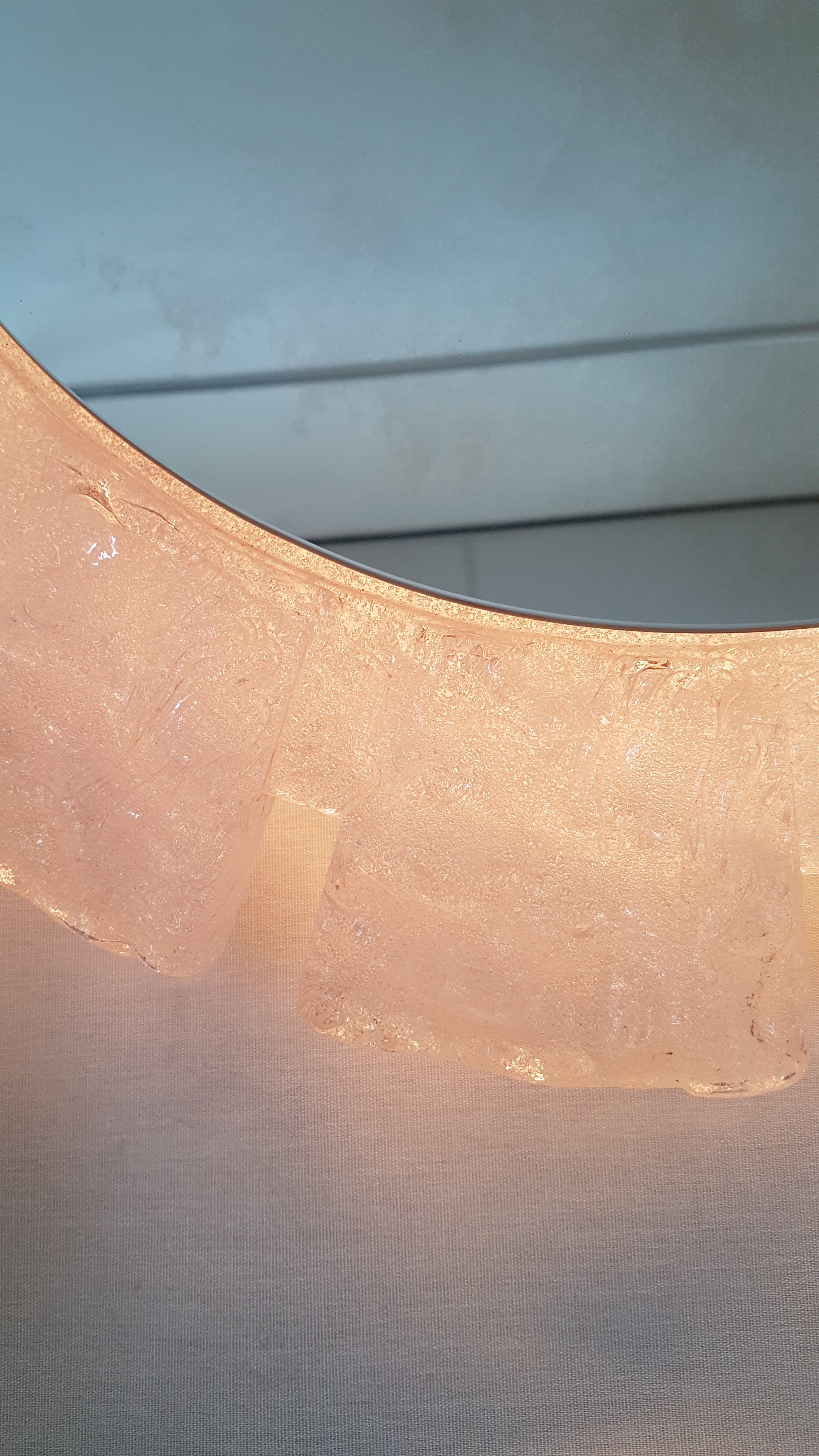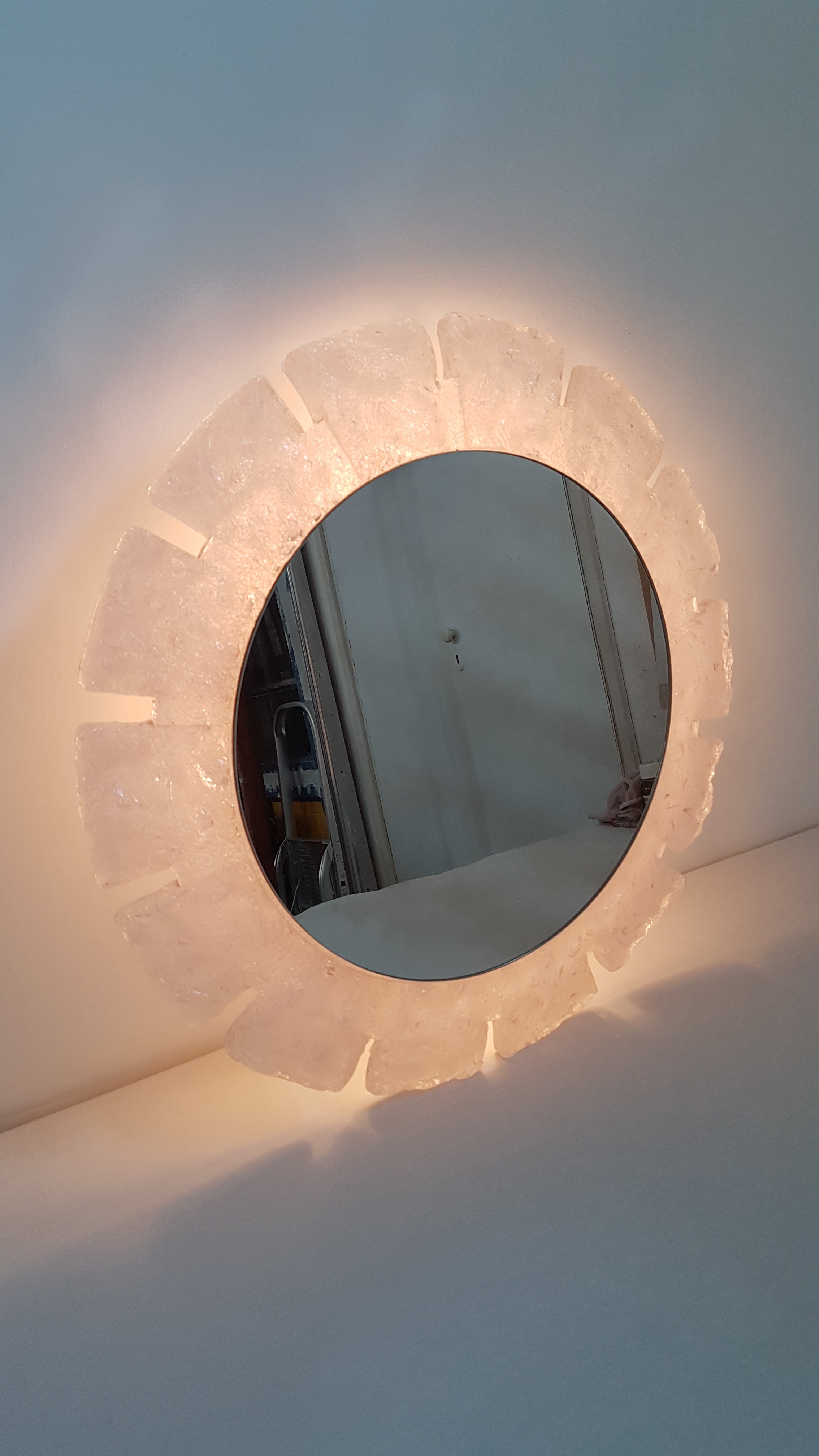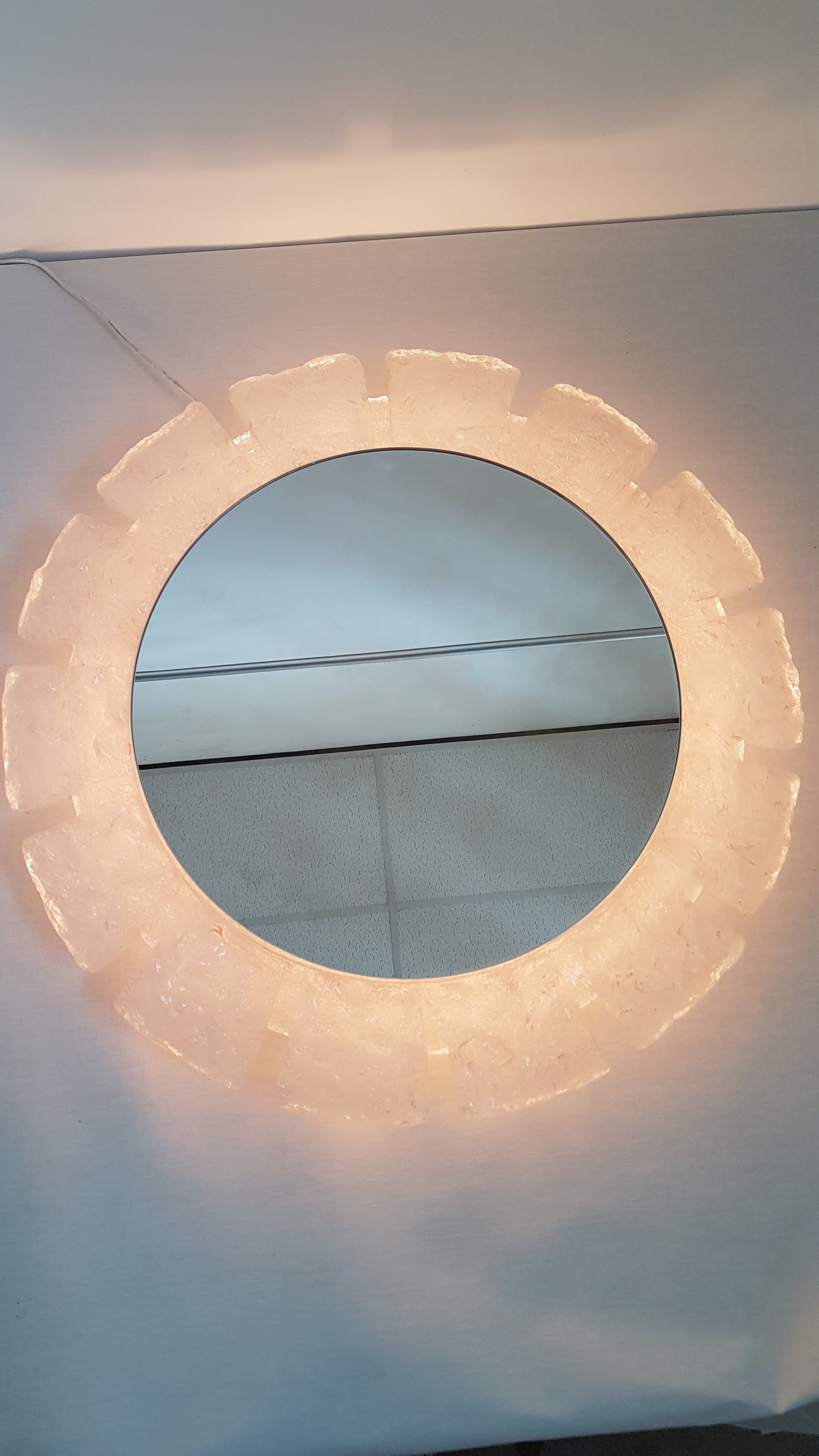 Round mirror with an acrylic edge that looks like ice glass. The mirror has 5 light points on the back, which illuminates the edge in a warm color.