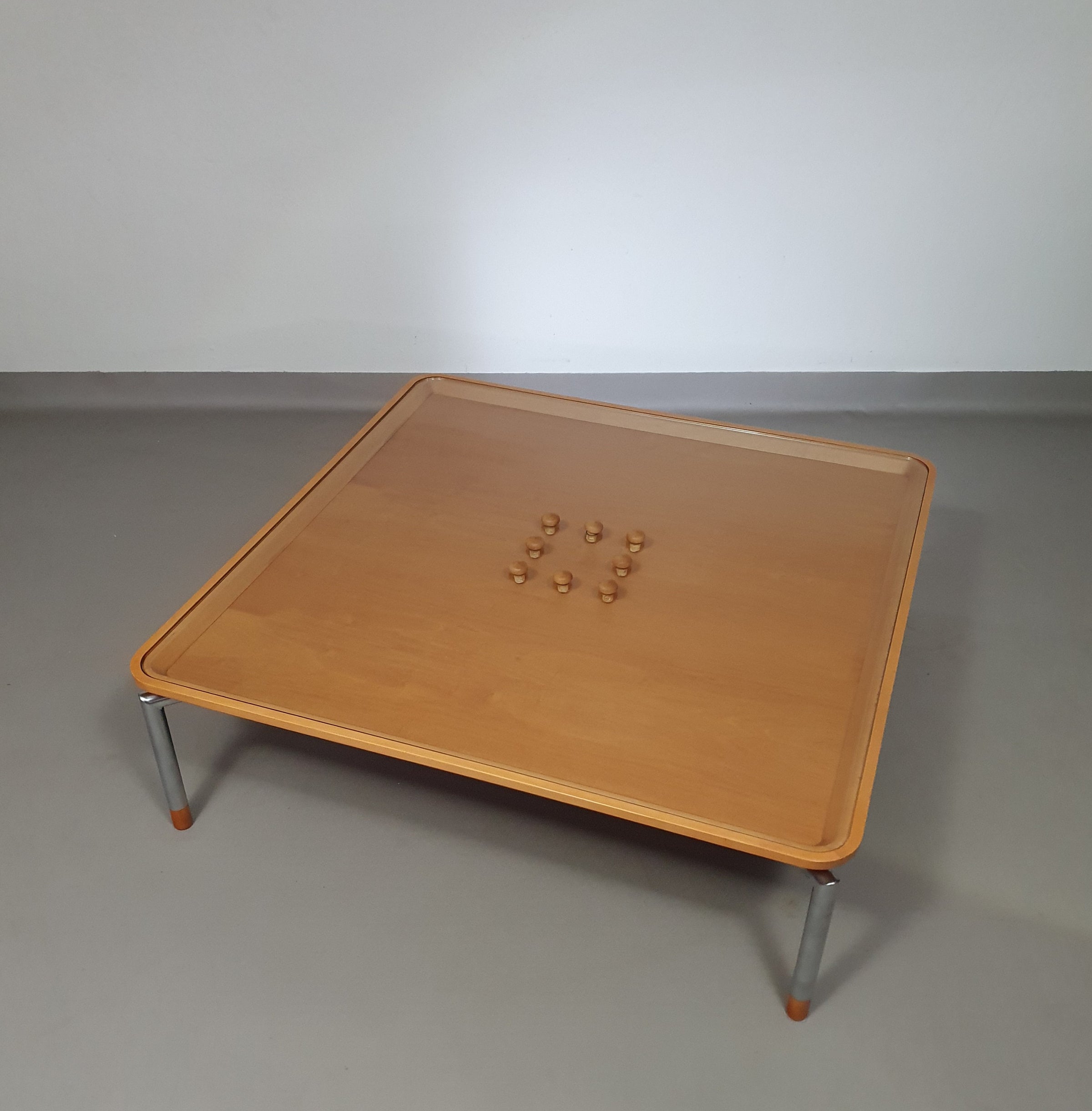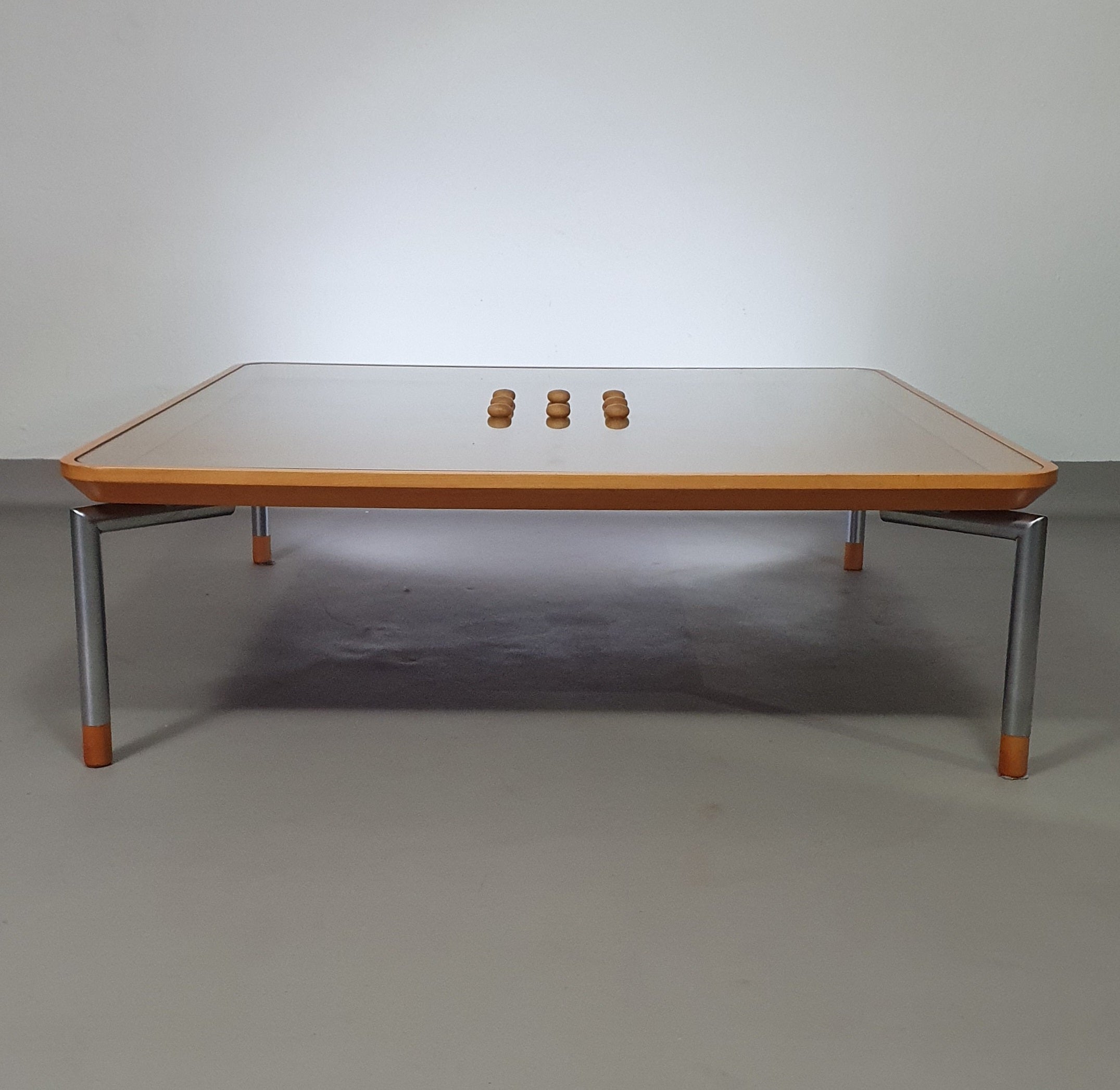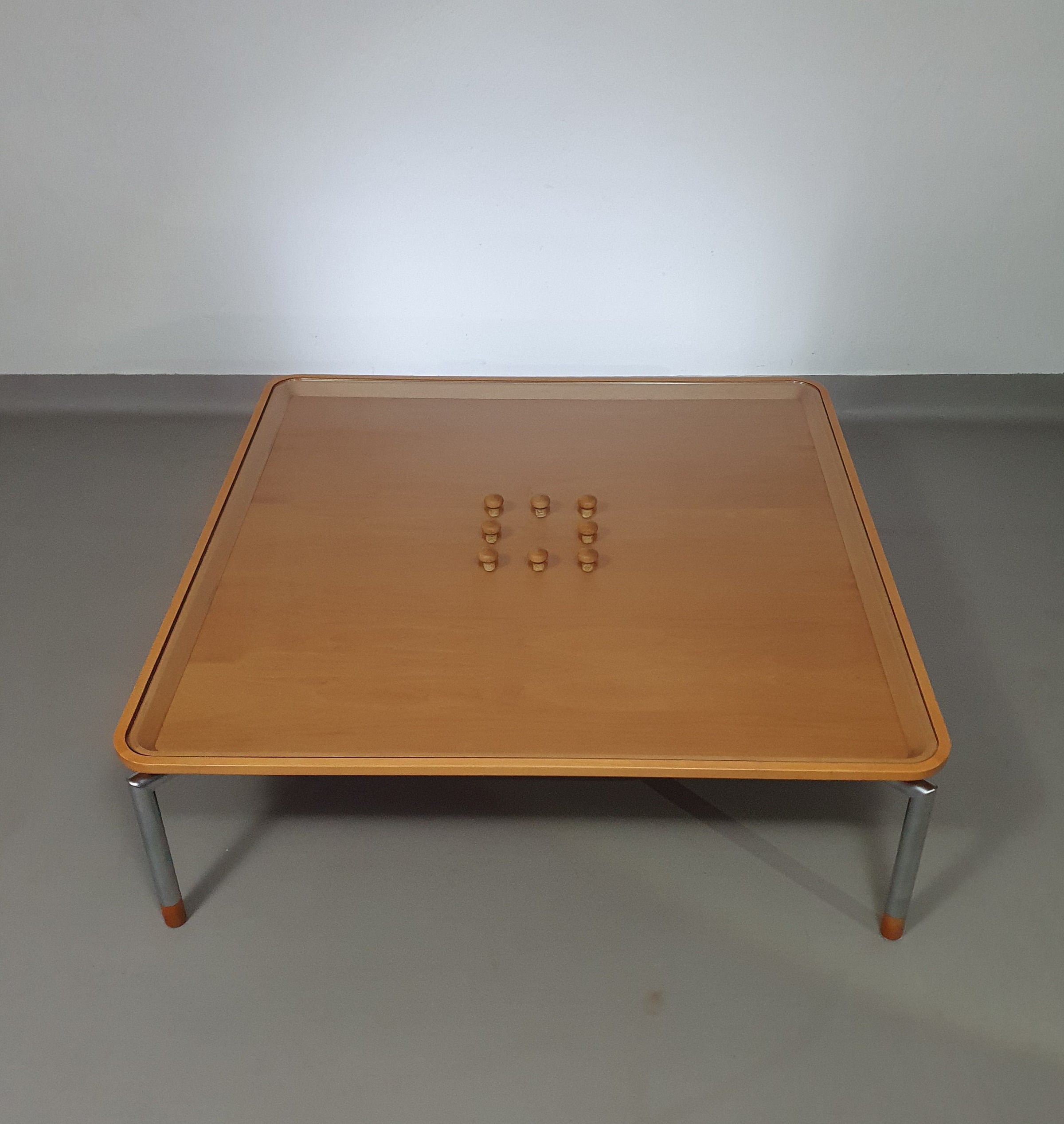 Rare coffee table 110 x 110 x height 35 cm with 8 flange wooden / cork caps in the glass top.