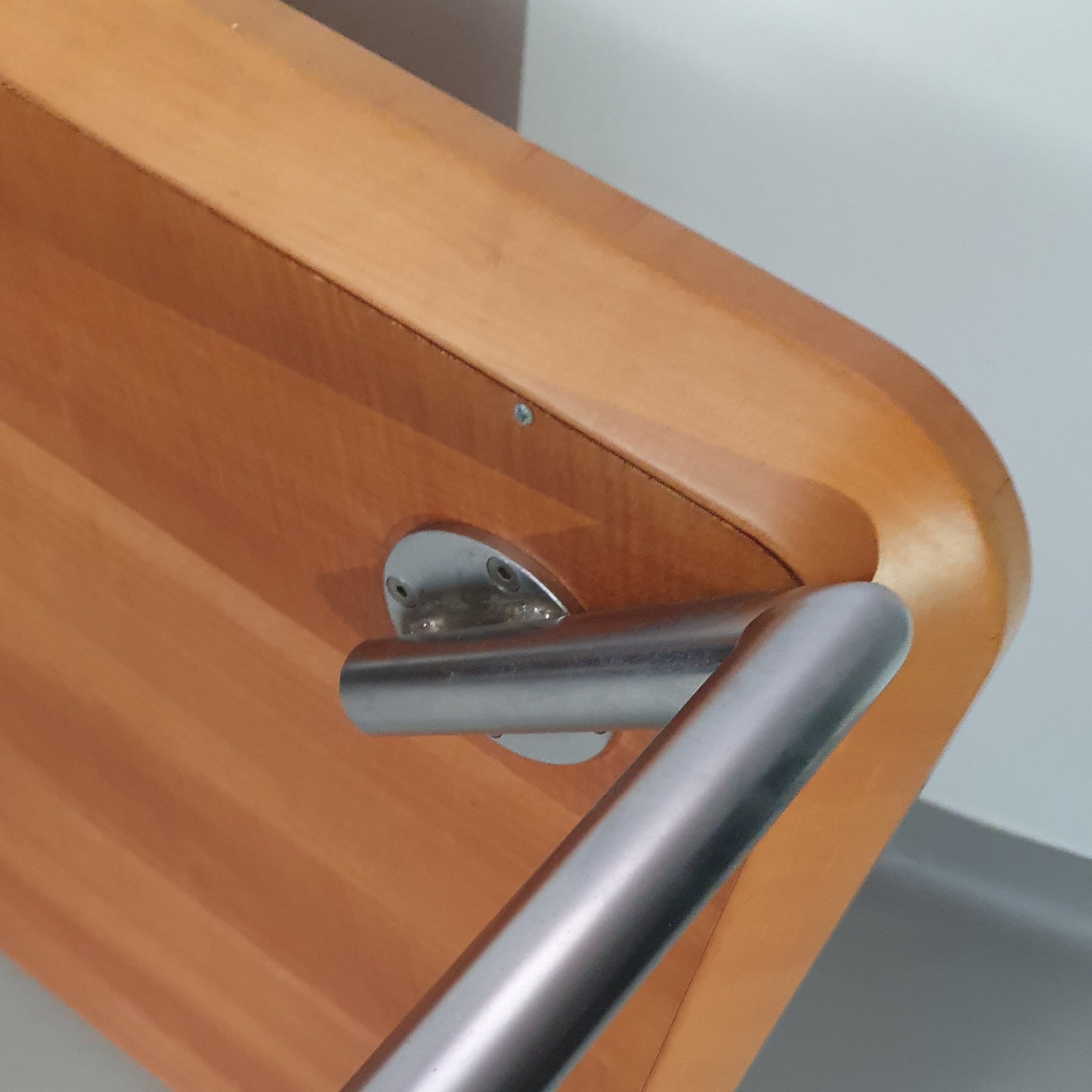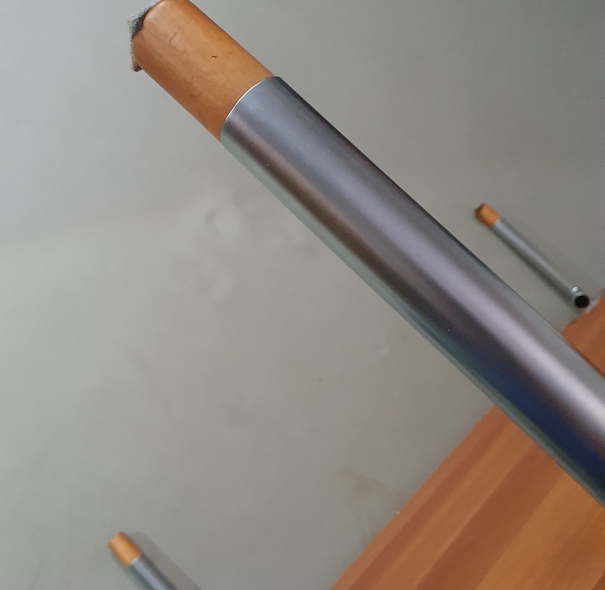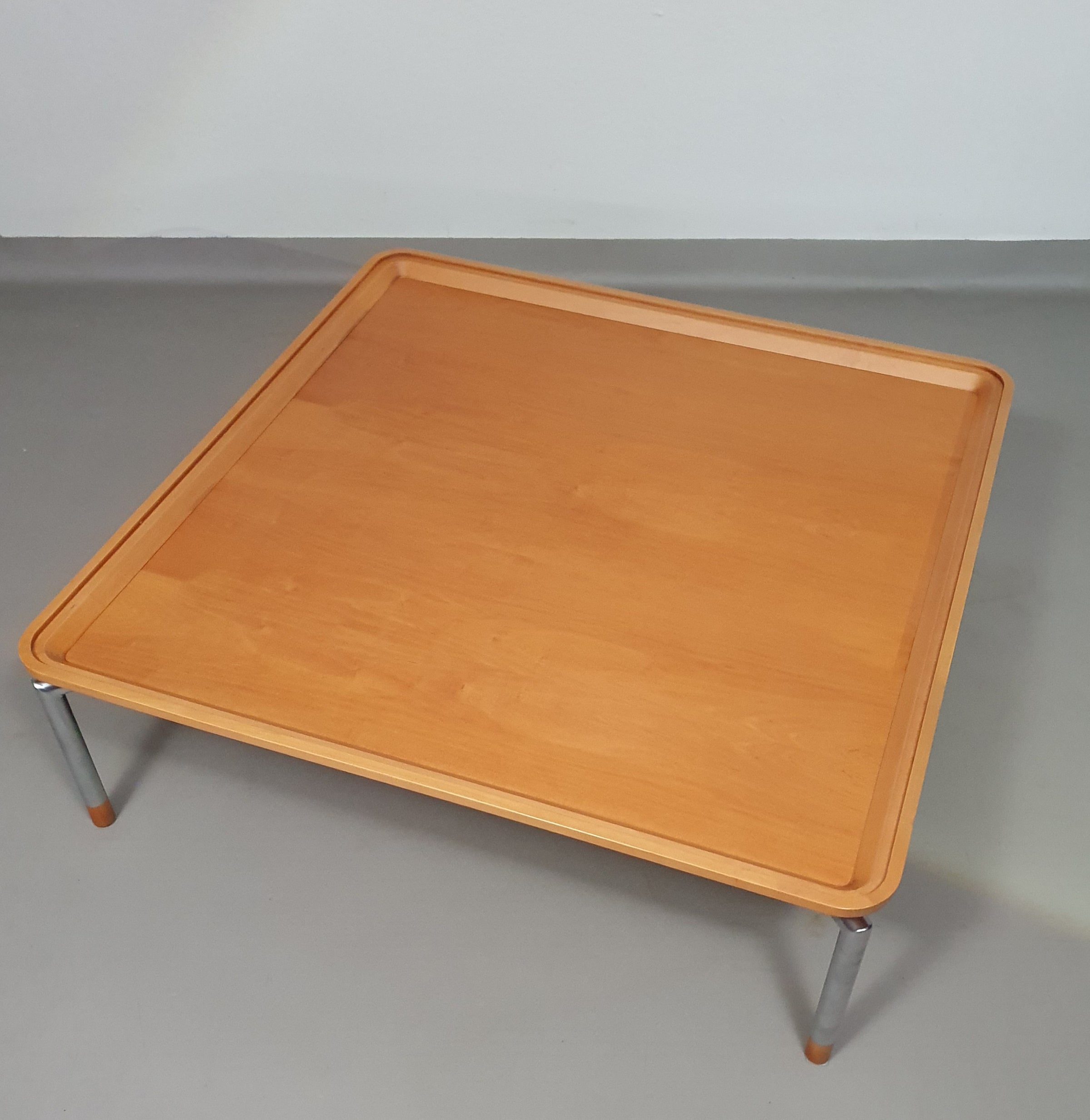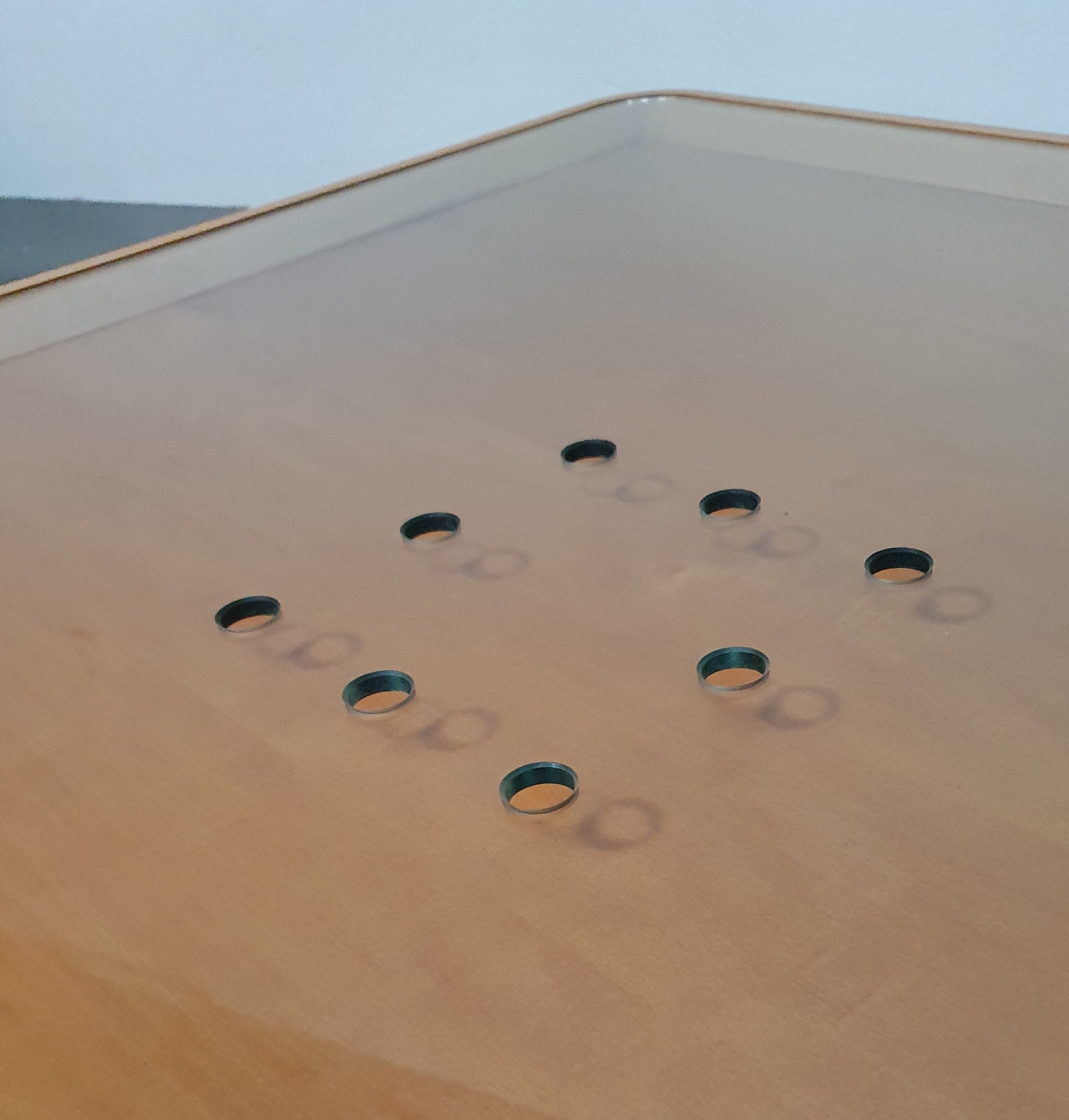 Rare coffee table 110 x 110 x height 35 cm with 8 flange wooden / cork caps in the glass top.