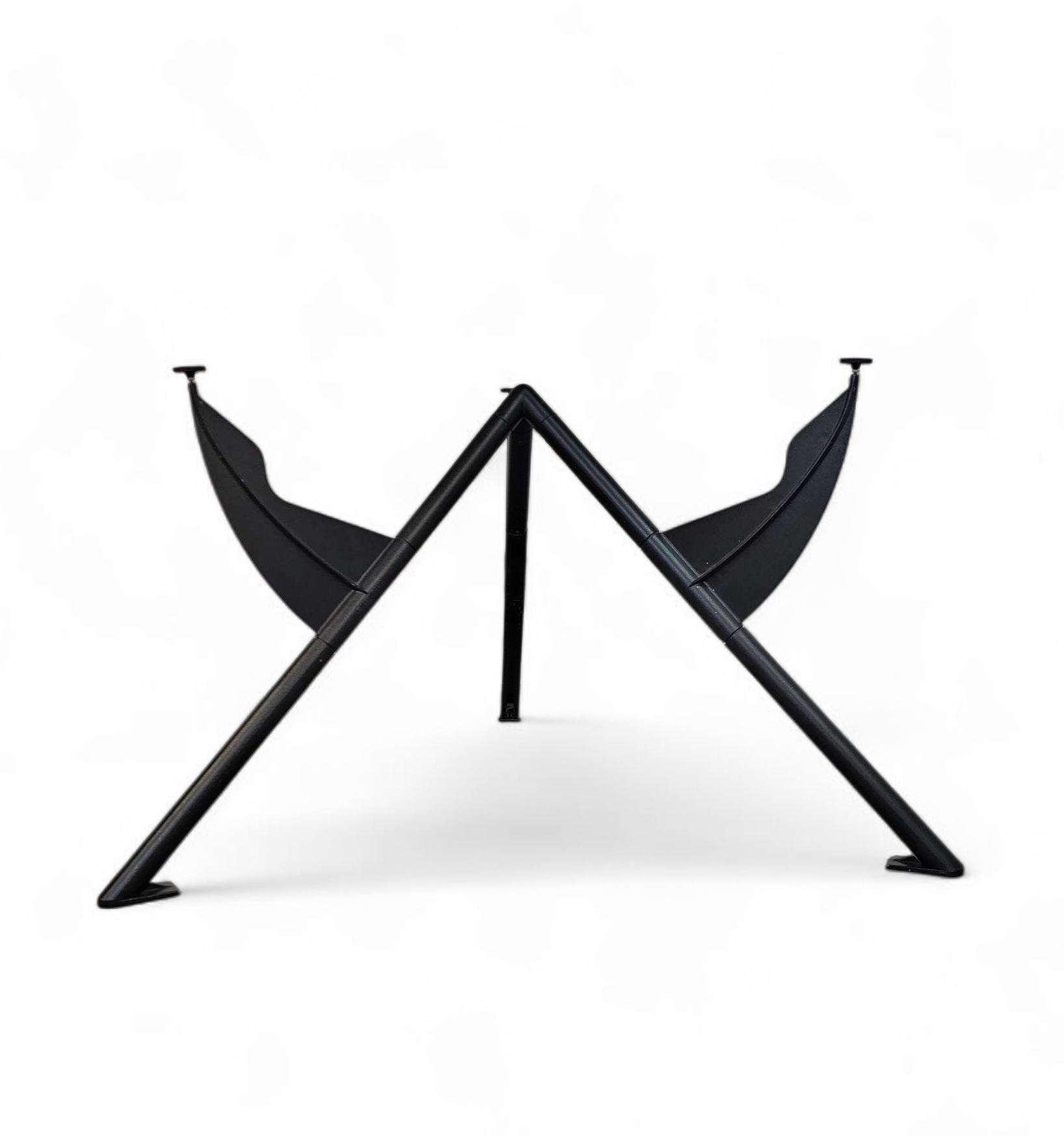 Designed by Philippe Starck in 1984 for François Mitterrand’s private office, the President M table stands out for its disassemblable structure and avant-garde design. Composed of three elements, its biomorphic aluminum legs, reminiscent of angel wings or fish fins, provide sturdy support to a floating glass top. This table merges striking visual impact with practicality, making it ideal for refined office or home settings.