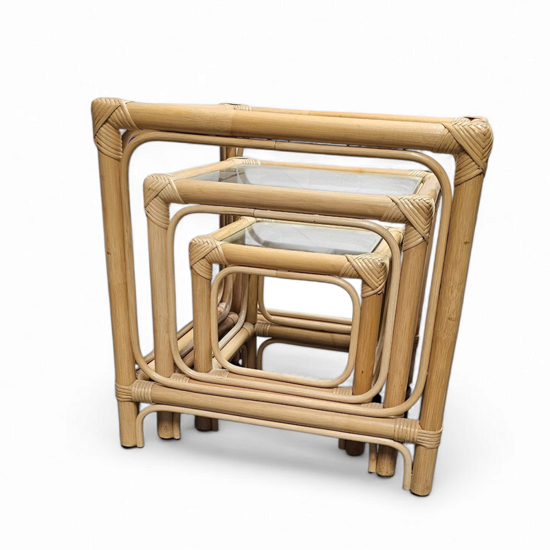 Bamboo nesting set / clear glass tops / side tables / 1970