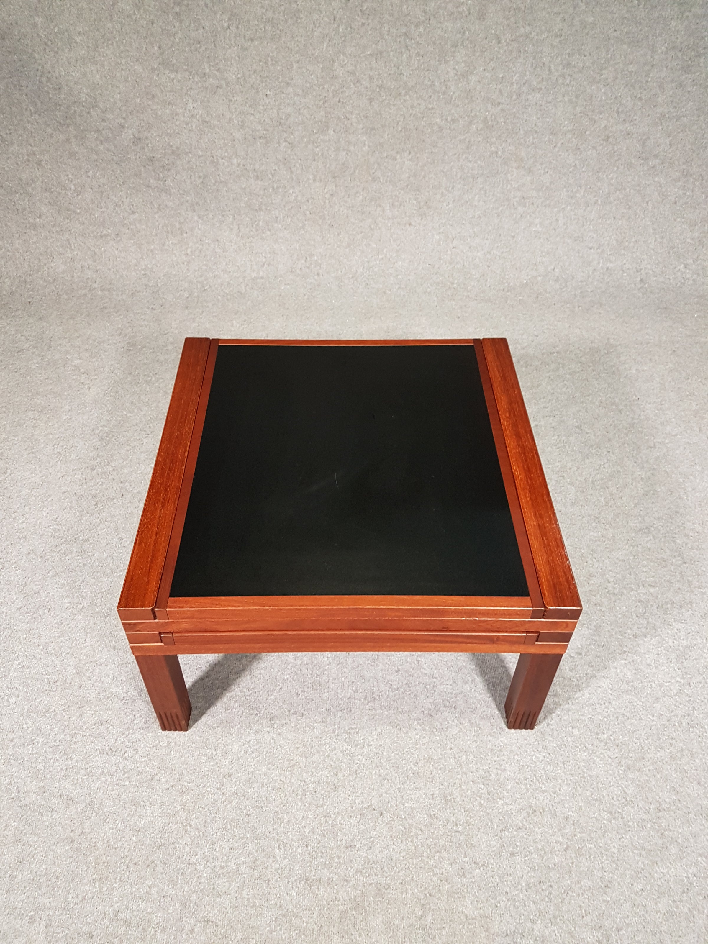 All four shelves slide and hide away beneath the table’s top smoothly. Normal small use marks consistent with age. Perfect square table design that would make a great match in a Midcentury style room