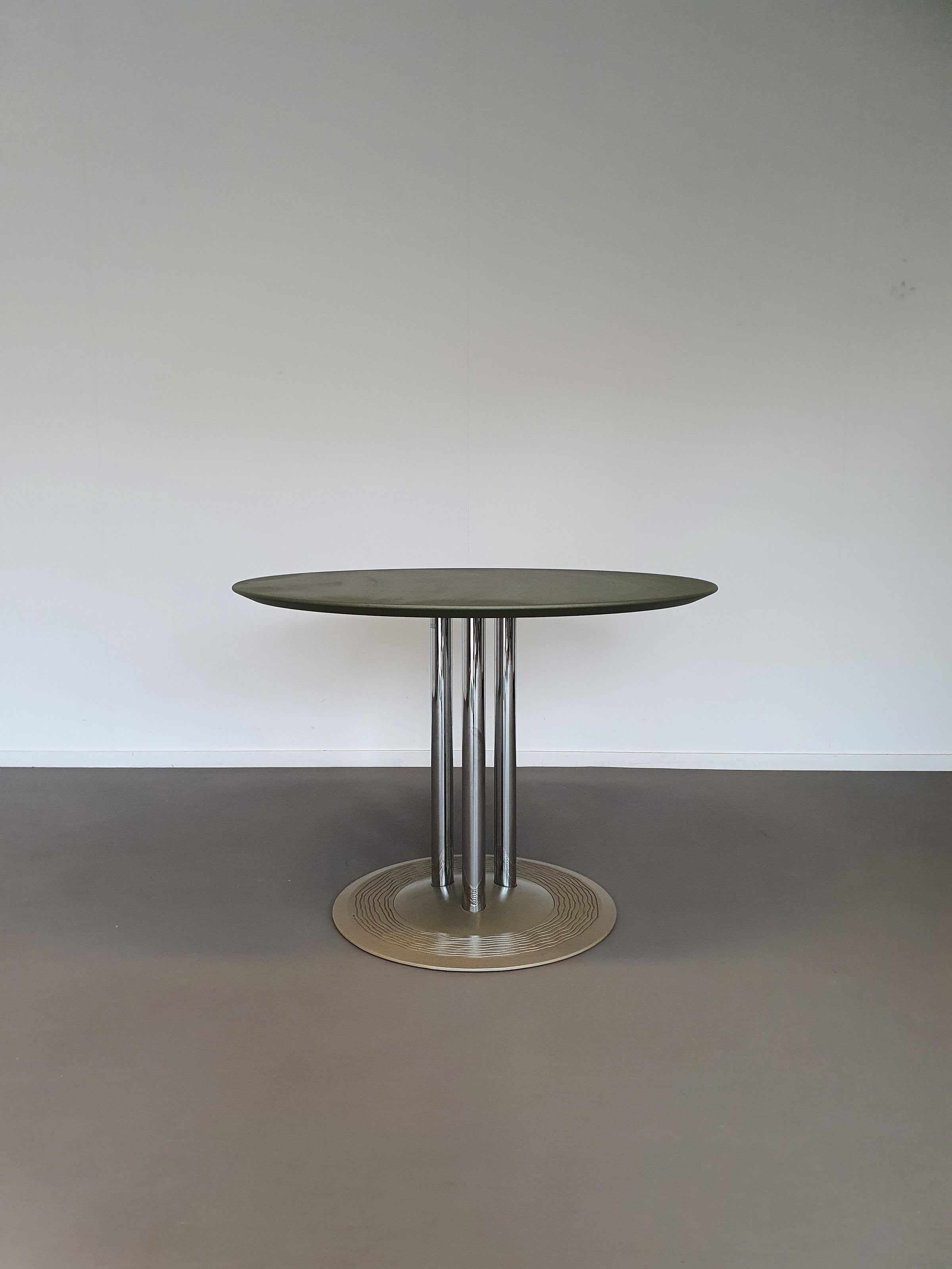 In 1980 Hugo de Ruiter (1959) started working as a product developer at Leolux. He will be head of the Product Development department and house designer at Leolux. He successfully combines his knowledge of the craft with his design knowledge. This results in furniture in which the central theme is “movement”. In 2001 he leaves Leolux and De Ruiter starts a “second life” as an independent designer; he wants to further deepen his signature and give his creativity a new impulse. Hugo de Ruiter still regularly works for Leolux from his studio. This Trias table is a good example of movement in furniture. The three legs of the round table provide a very solid round table without any legs getting in the way. The table is made to enlarge, where an intermediate leaf could be placed. This table lacks that intermediate leaf, but the function is preserved.