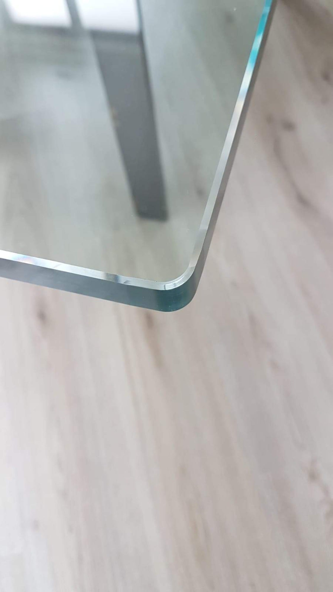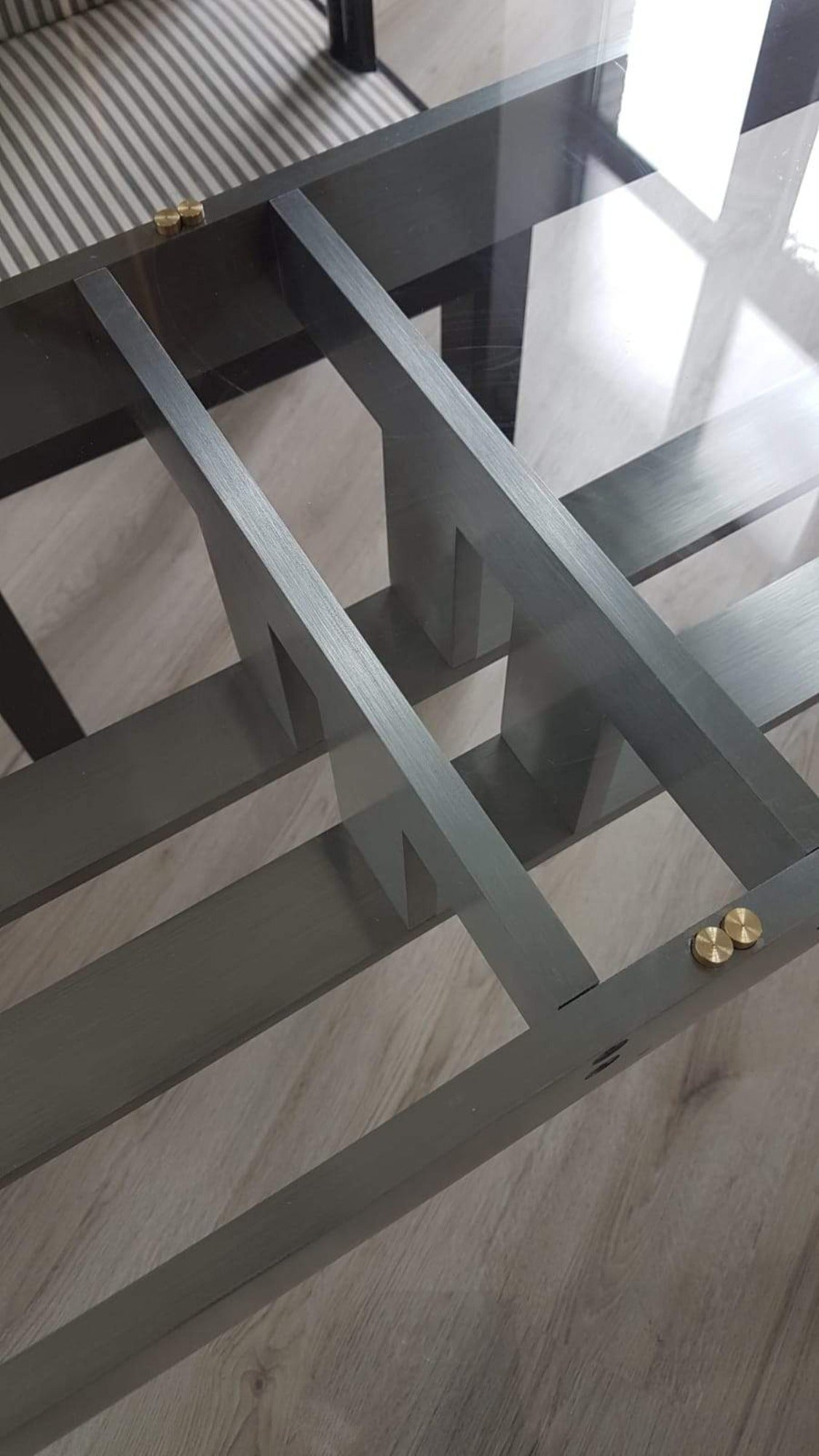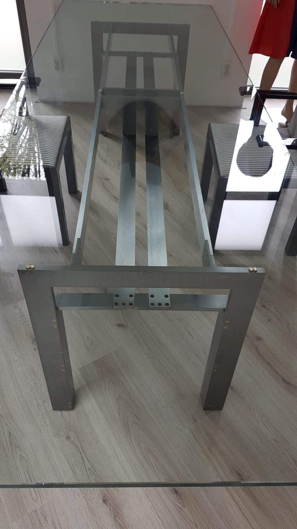 Tijdloze klassieke eettafel Doge van Carlo Scarpa, massief geborsteld stalen onderstel verbonden met messing inbusschroeven en een zwevend glazen blad (1,5cm) met gepolijste randen.